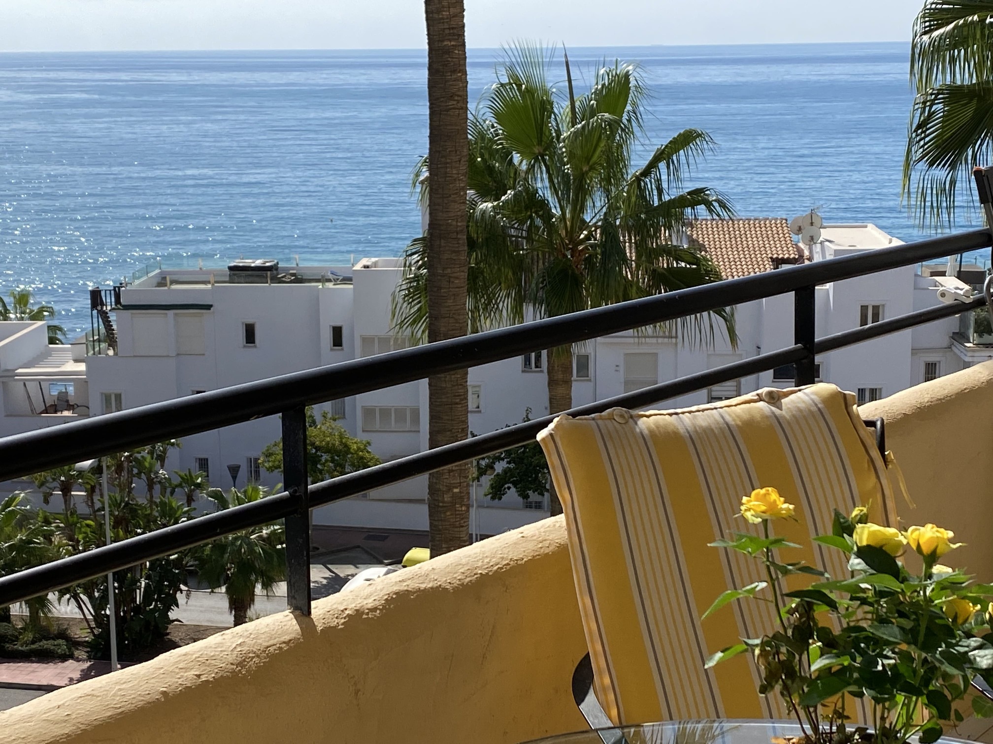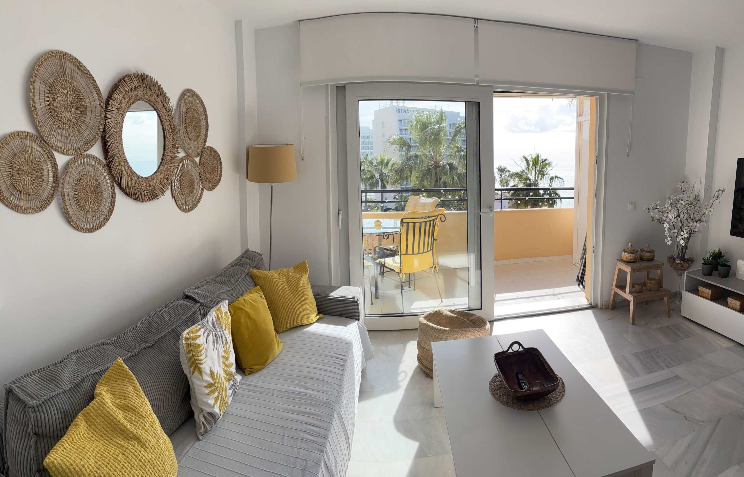 Luminoso salón con un sofá gris, almohadas amarillas y decoración tejida en la pared, que da a un balcón con una silla y una mesa amarillas. Los grandes ventanales de Bluebenalmadena dejan entrar la luz del sol y ofrecen vistas a las palmeras y al mar.