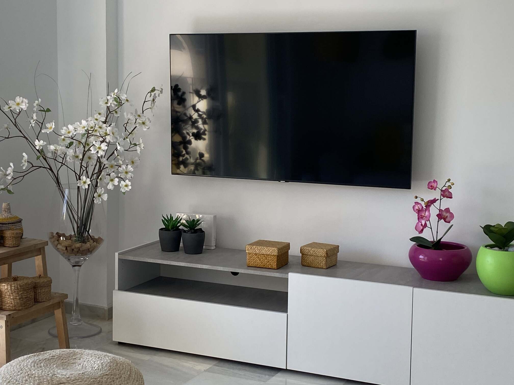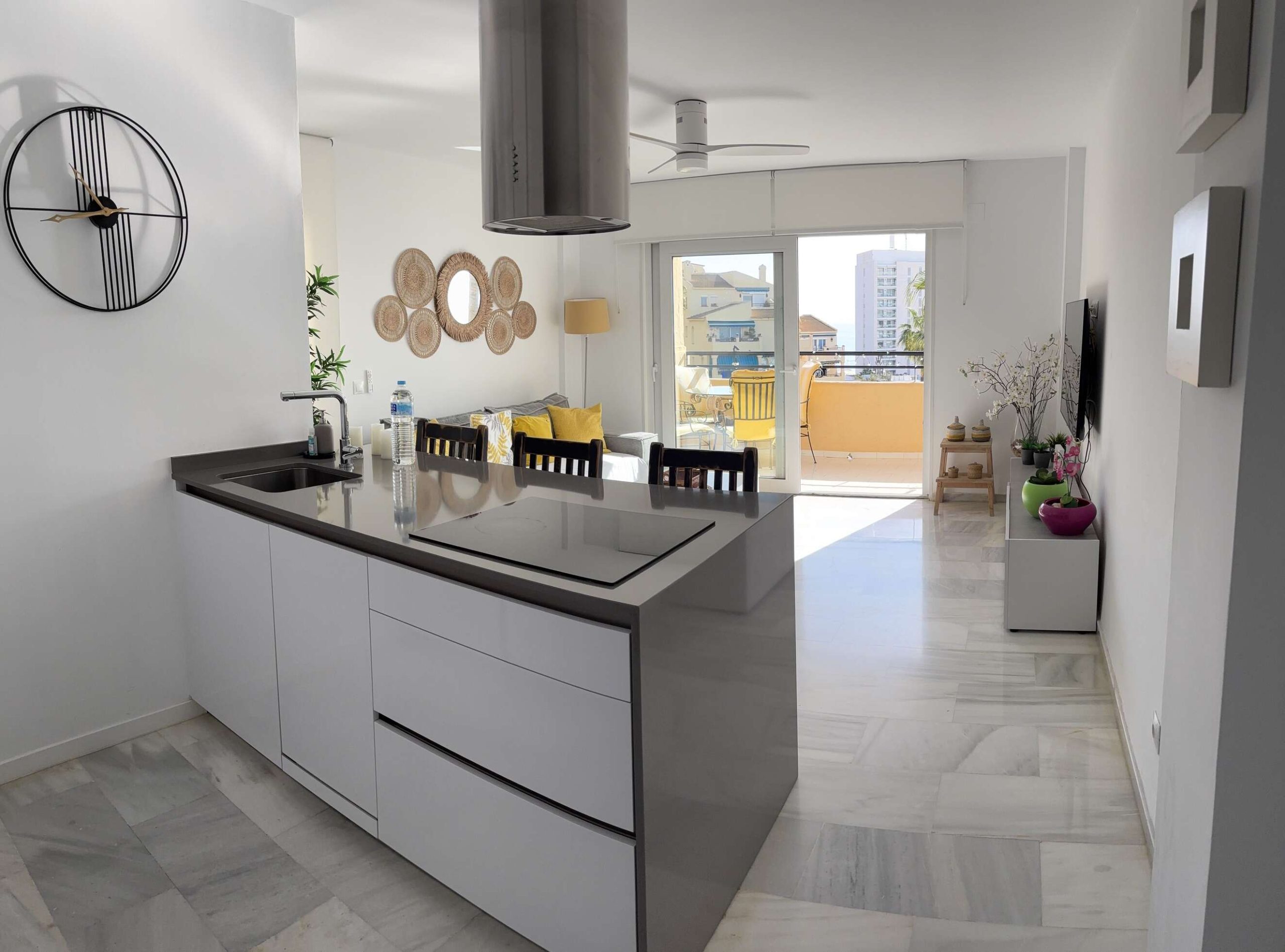Moderna y luminosa cocina abierta y sala de estar con armarios blancos, encimera gris, reloj de pared, mesa de comedor y detalles amarillos. Las puertas correderas se abren a un soleado balcón Bluebenalmadena con asientos al aire libre.