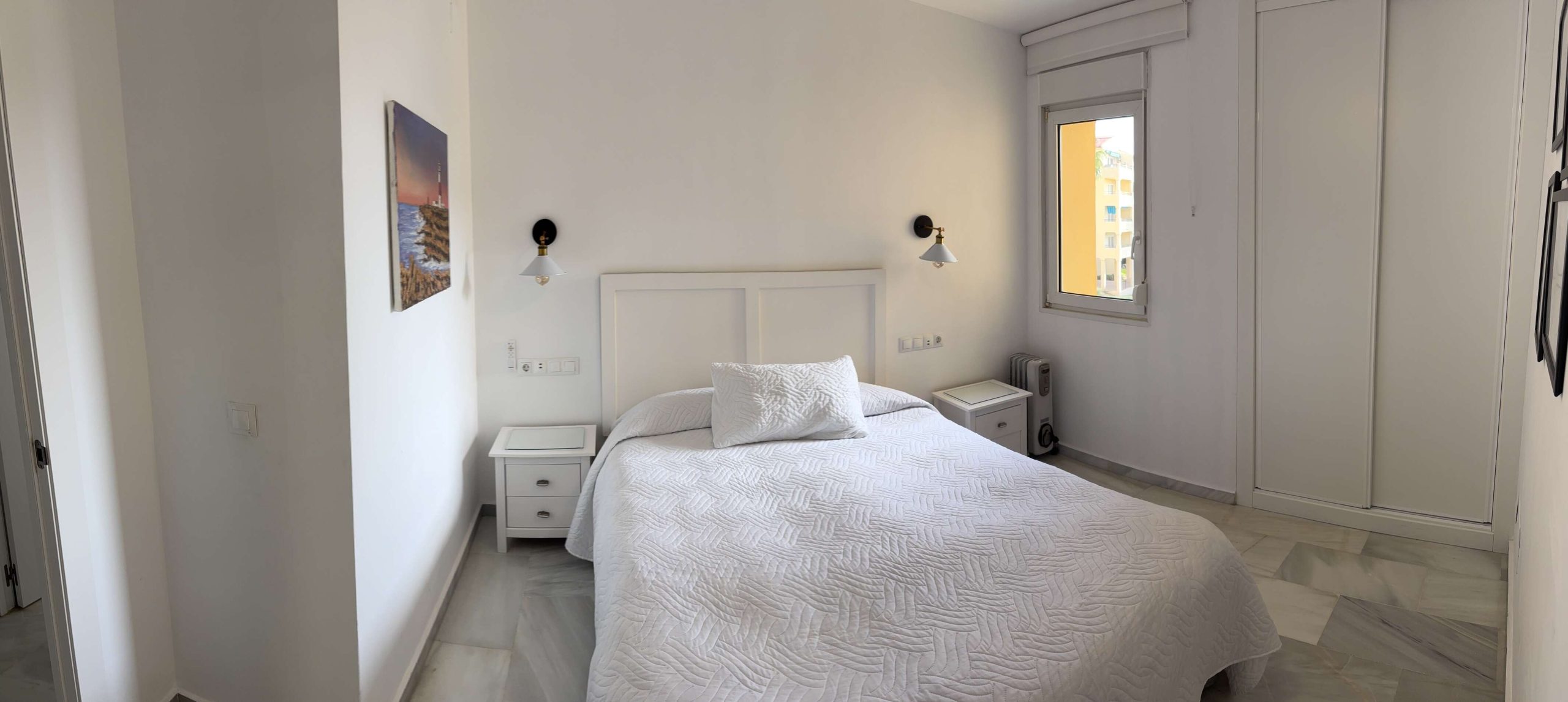 Un dormitorio luminoso y minimalista de Bluebenalmadena con una cama de matrimonio, ropa de cama blanca, dos mesillas de noche, lámparas de pared, una ventana iluminada por el sol y un armario. Una foto enmarcada cuelga de la pared izquierda.